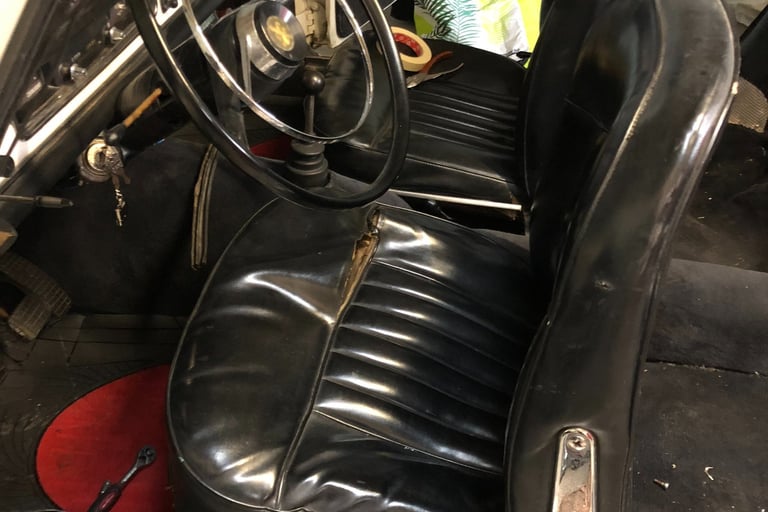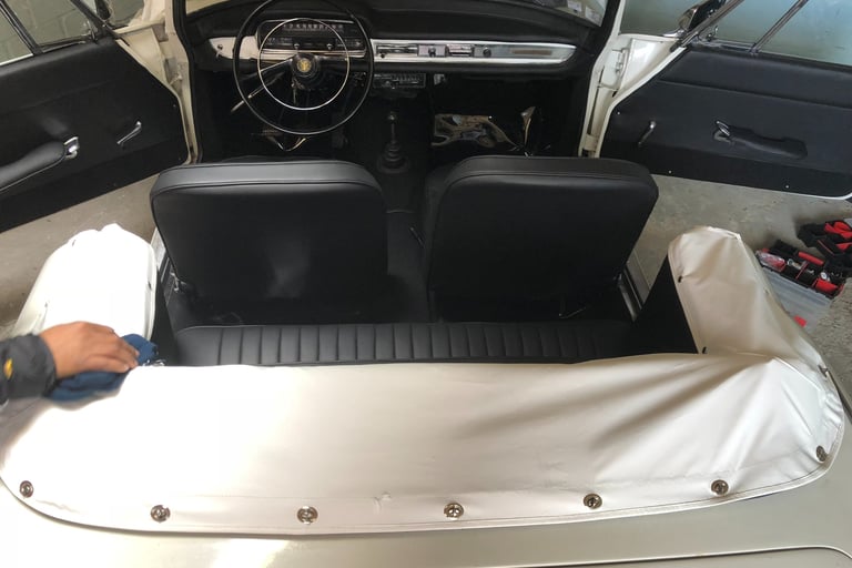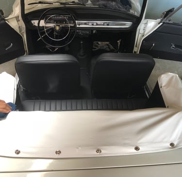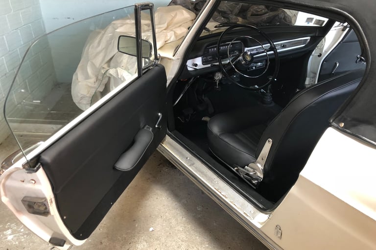 Pour l’automobile, nous réalisons sièges, panneaux de porte, ciel de toit, capotes, volants… rénovation ou création sur mesure, Pour toute marque et génération voici notre travail pour une peugeot 404